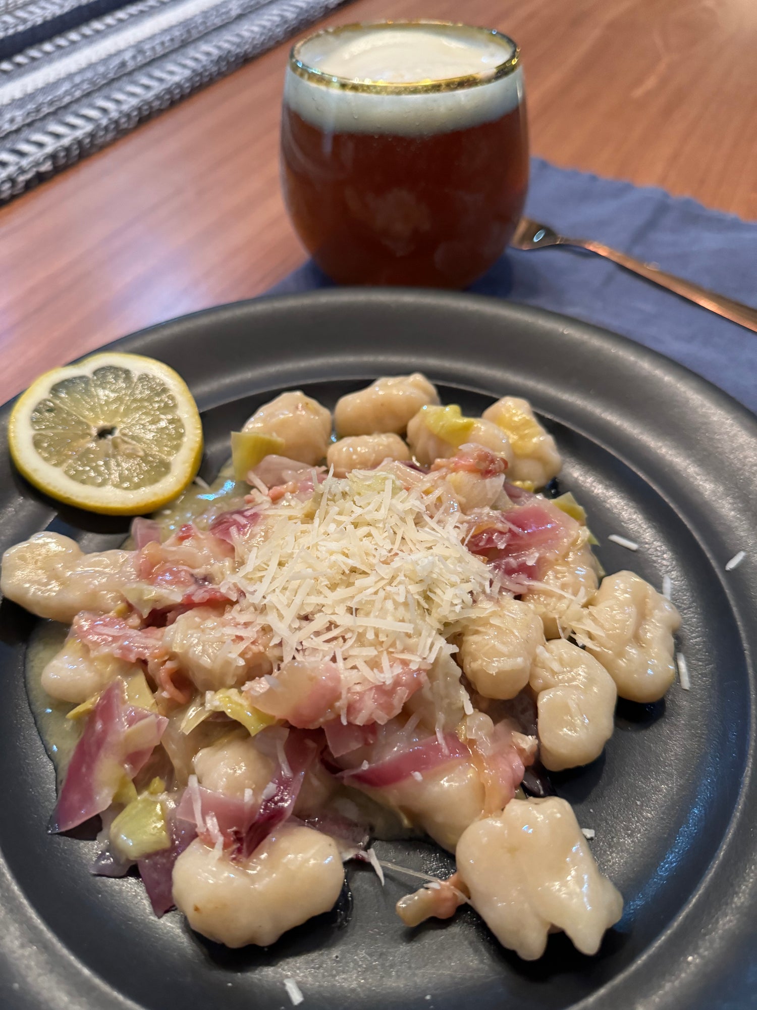 Definitivamente recomiendo que se sirva en un plato oscuro, porque la cromática del guiso es de colores pálidos claros, pero muy contrastantes entre sí. Tienes un amarillo claro de la alcachofa cocida, un morado pálido del echalote cocido, y un morado más profundo del guanciale. El color beige de los ñoqui es la base tonal. En un plato claro, se pierde bastante espectacularidad cromática.